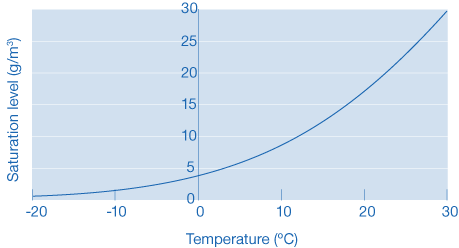暖気は冷気より多く湿気を吸収できるため、この値は空気の温度によって変化します。従って、空気中の最大湿気レベルは冬季より夏季のほうが高くなります。