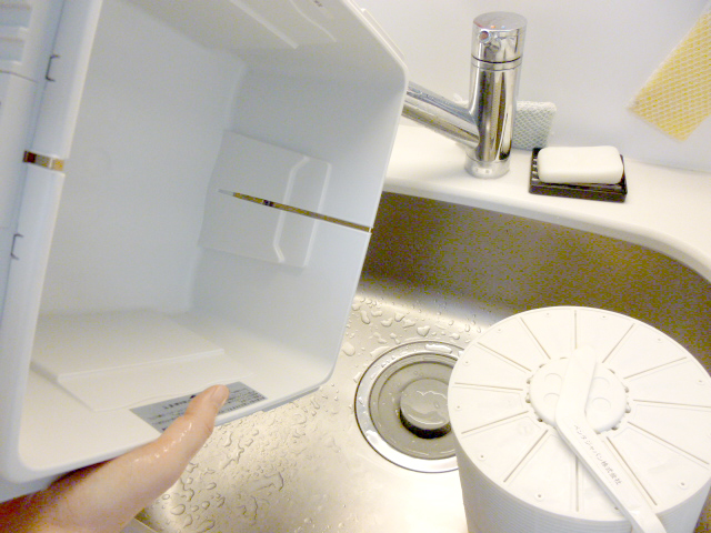①上部ハウジングを外して、ローラーディスクを下部ハウジング内から取り出し、洗浄水を捨てます。